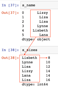 Pandas looks up the value in s_names and tries to associate it with a corresponding index in s_sizes, returning the value from s_sizes if available.