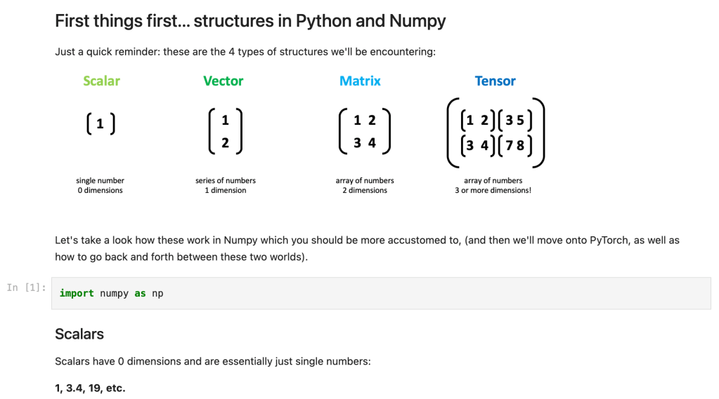 In 2020 I completed the Udacity Deep Learning Nanodegree, which focuses on implementing a variety of deep learning architectures using PyTorch. At the outset, it’s pretty fundamental to understand the data structures you’ll be encountering as inputs to and outputs from your neural network architecture. What I noticed was that plenty of the issues encountered by me and my fellow-students arose from misunderstanding either the shape or format of the data, going in, being processed, or coming out: you need to actually have a nice mental map of how your data is transformed at each step. The accompanying Jupyter Notebook tutorial aims to cover all those basics, and assumes a good level of prior Python knowledge as well as a smattering of linear algebra but no prior knowledge of PyTorch. I hope it may help you to get up and running quickly!
