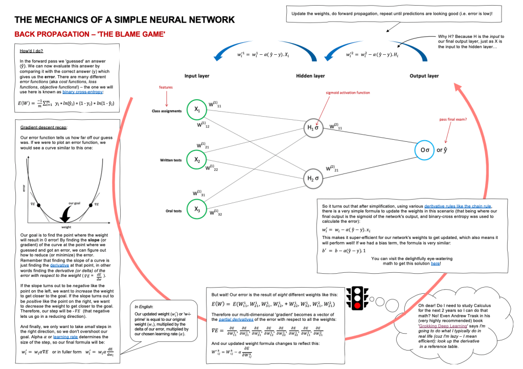 I created this cheat sheet to remind myself of some of the foundational concepts of neural networks. My goal was to create a two-page at-a-glance document that could serve as a reminder on how each component of a neural network works and how each fits into the bigger picture. It isn’t designed as a beginner’s document, but rather as an aid to memory and conceptual understanding. The cheat sheet was inspired by lessons learned through Udacity’s Deep Learning Nanodegree, as well Andrew Trask’s excellent book Grokking Deep Learning.