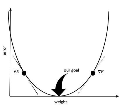 Our goal is to find the point where the weights will result in 0 error (or as near as we can get to 0 error – this is not Utopia after all). By finding the slope (or gradient) of the curve at the point where we guessed and got an error, we can figure out how to reduce (or minimize) the error. Remember that finding the slope of a curve is just finding the derivative at that point, in other words finding the derivative (or delta) of the error with respect to the weight.
