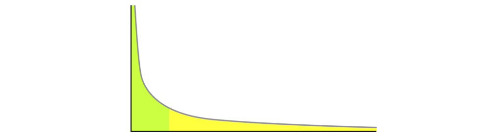 Sack (2011) looked at character ‘mention’ frequencies in a set of sixty 19th century British novels and noted that character frequencies often showed a long-tailed distribution – which makes sense: main characters will be mentioned more frequently than incidental ones (with the possible exception of books written in the first person). If this assumption held true for our books (which it turned out it did), then ideally I wanted to have extracted most of the characters occupying the green area shown below and these should represent the main characters of interest.