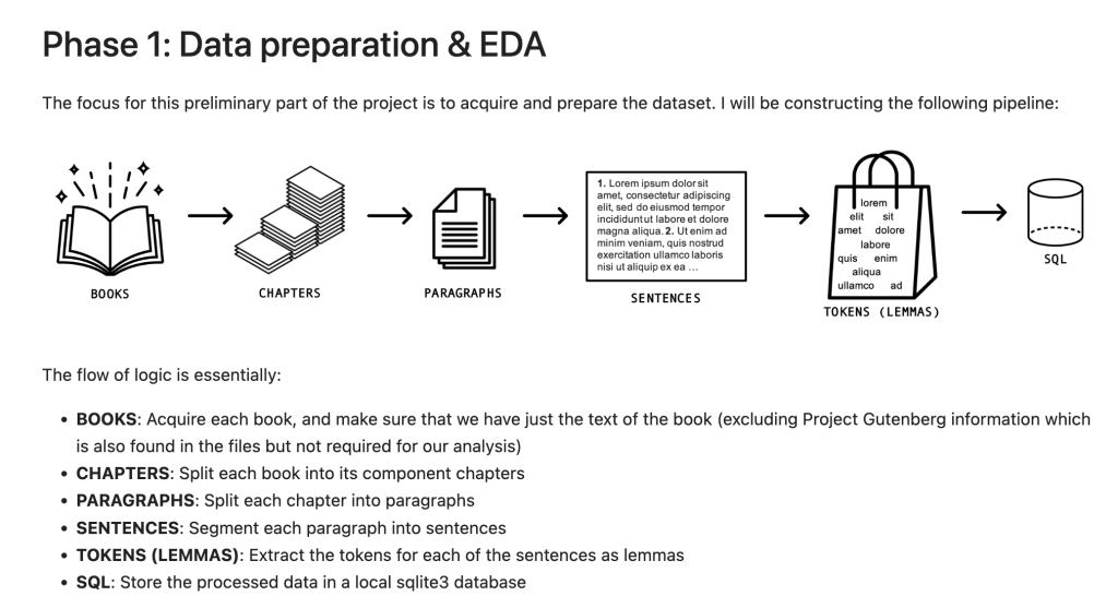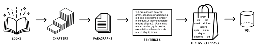 - Data preparation, where the raw text from the books was pre-processed and the final information on chapters, paragraphs, sentences and tokens was stored in a SQL database