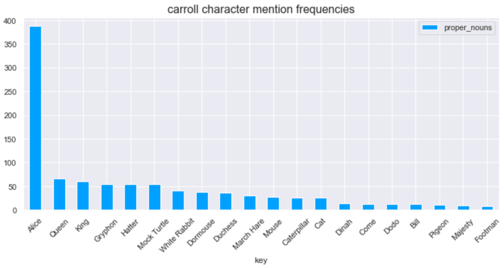The advantage of this method is that, being simpler, it can be more robust. On the other hand, it does return rather more noisy results including place names, organizations, products and the like. In documents like news articles this would be a real issue. However, in novels I worked on the simplifying assumption that most of this noise will occur lower down in the list of entities: the most frequent proper nouns we’ll encounter will be people, followed by places. If this assumption holds true then the majority of the proper nouns near the top of the list will be characters.