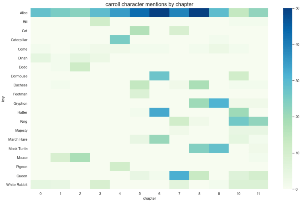 In Alice in Wonderland, being a children’s story, the procession of characters is quite clear and simple. Alice is strong throughout (this is her story after all). We can also see key groupings, for example, in the seventh chapter (labelled 6 below as counting started from 0) we see Alice, the March Hare, the Hatter and Dormouse gathered together for the famous ‘Mad Hatters Tea Party’.