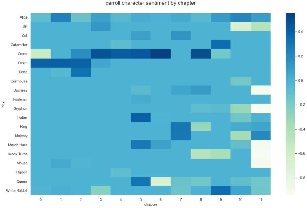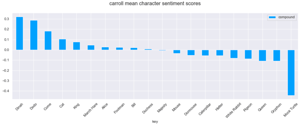 Alice in Wonderland has the most even spread of positive and negative characters: the extreme positive being Alice’s beloved cat Dinah and the extreme negative being the melancholy Mock Turtle make sense.