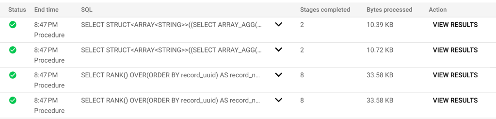 The first 2 items above SELECT STRUCT, etc. will contain the code to be executed for each record, click on VIEW RESULTS and you will see the query text generated for each script.